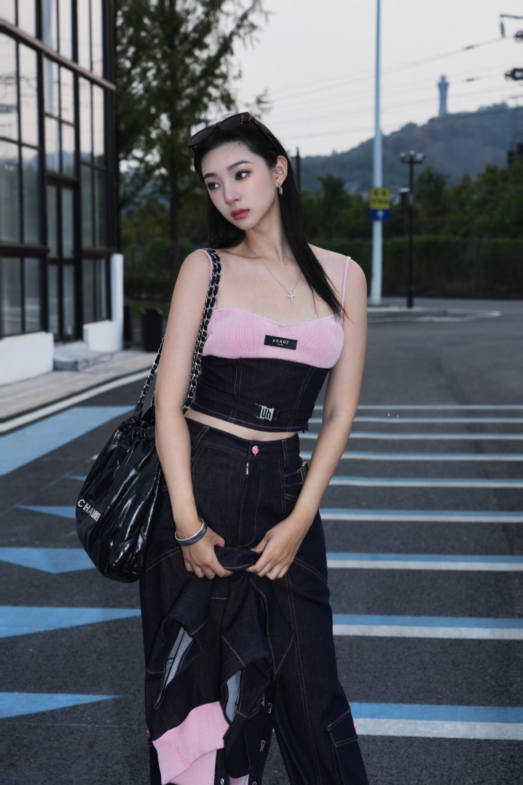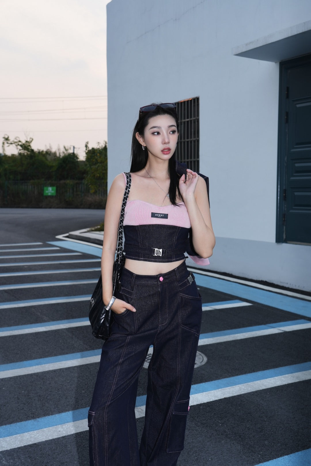 Uhot 粉色牛仔拼接吊带背心